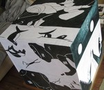 - Kubus 51cm3 : in opdracht . titel : De grens : ' extreem veraf en ongelooflijk dichtbij ' . Werk gelijmd op houten box 3 dimensioneel